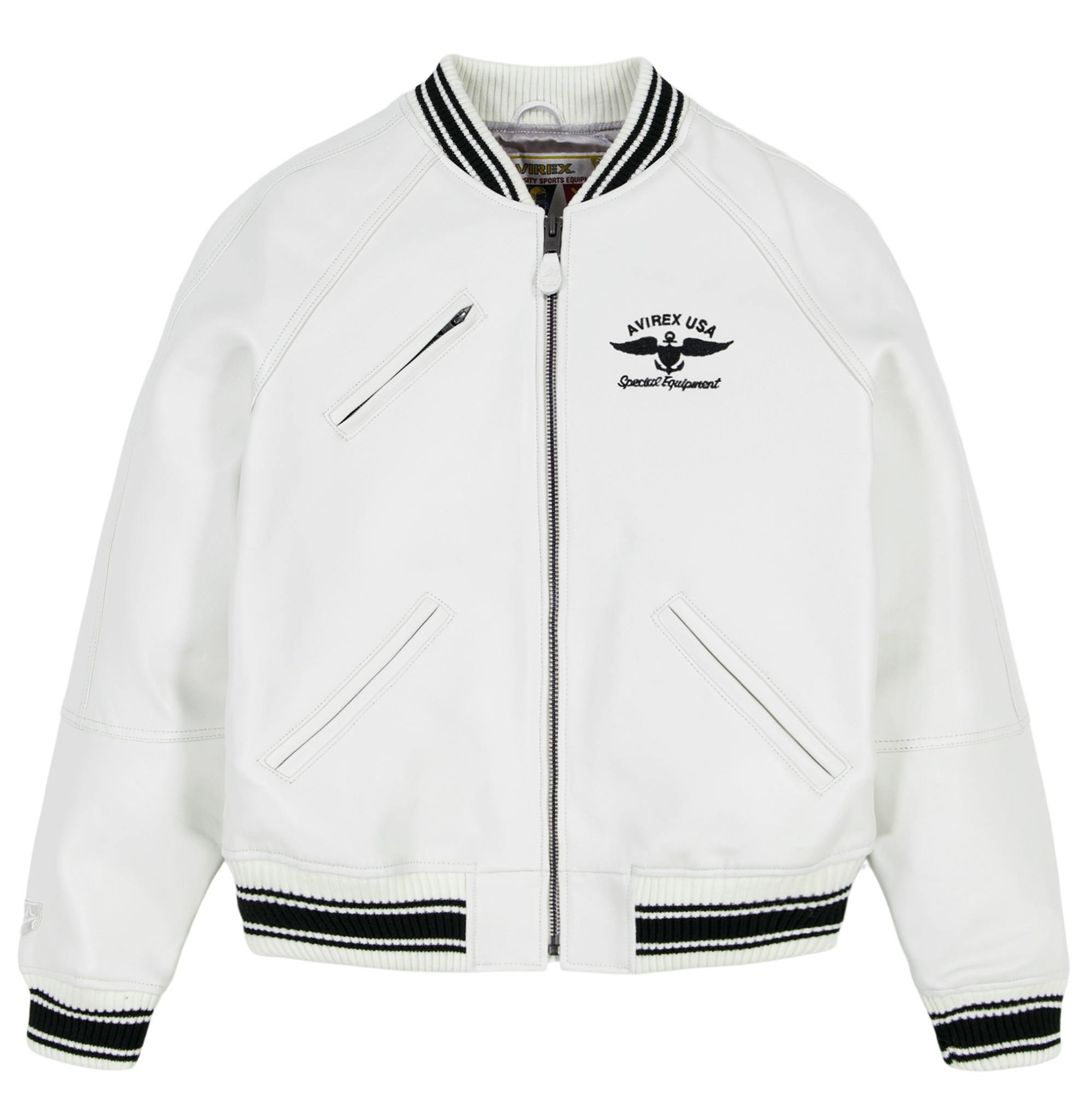 Avirex varsity jacket in 100% antique European lamb leather. Features Avirex embroidery on front chest and Avirex USA applique and embroidered art patch set on back.