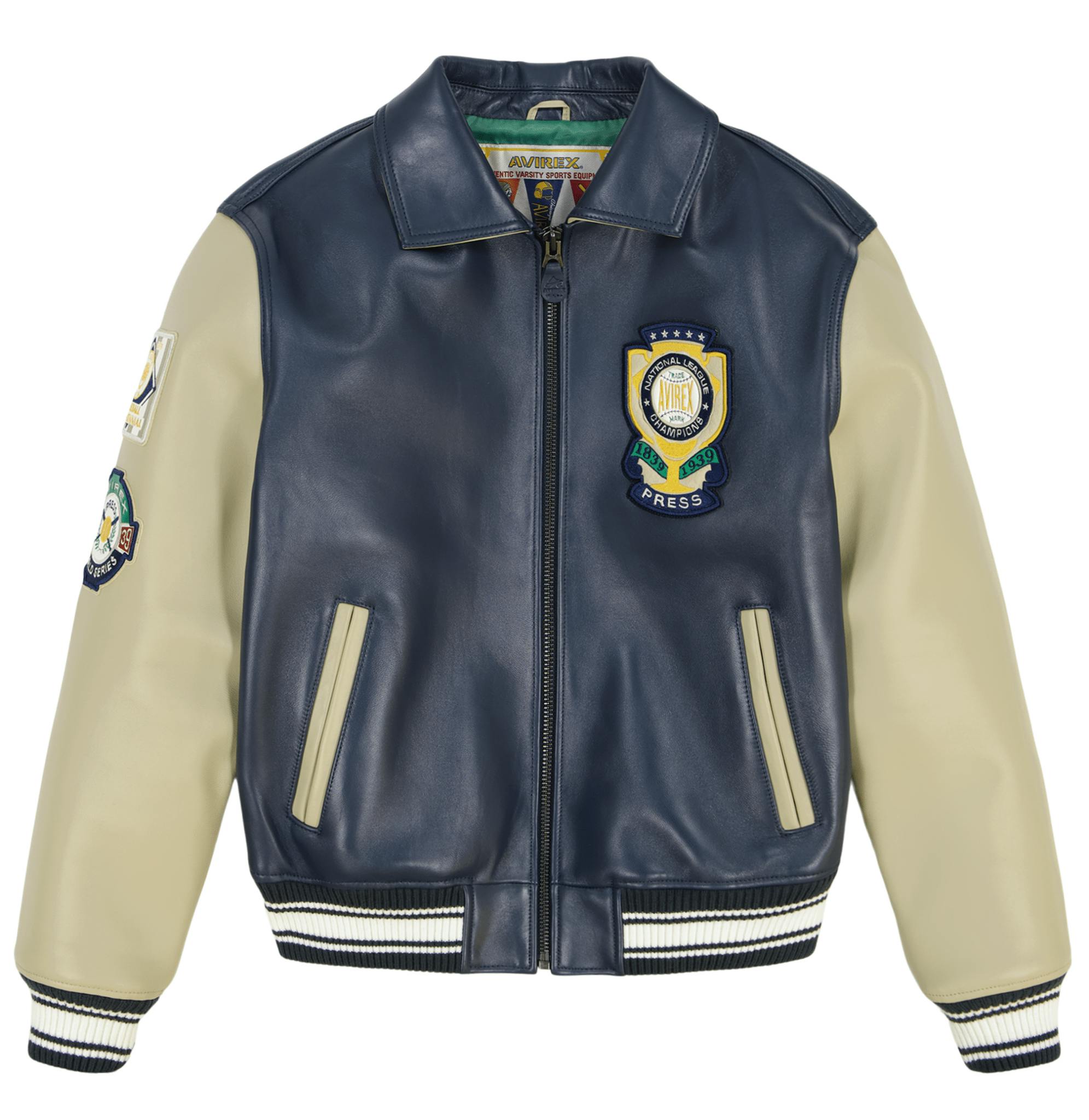 Avirex World Series jacket in 100% leather with World Series embroidered applique at chest and back.